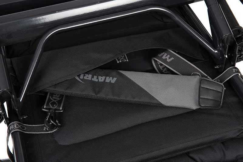 Scaunul este echipat cu 4 picioare telescopice reglabile Ø 36 mm, care ofera stabilitate pe orice tip de teren si compatibilitate cu accesoriile modulare Matrix. Scaunul si picioarele se pliaza perfect plat, ceea ce il face usor de transportat si depozitat.