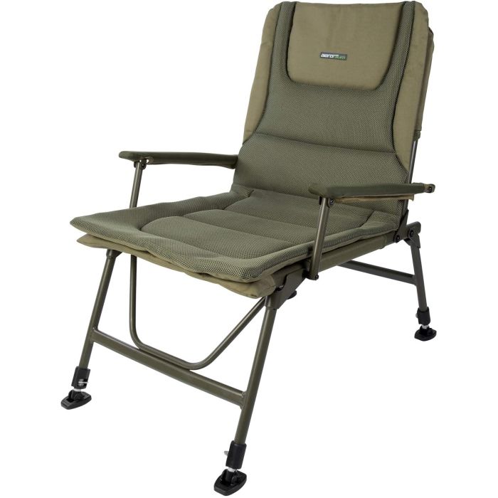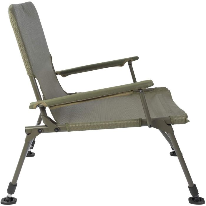 Materialul textil al scaunului este impermeabil, peste acesta avand o " saltea" moale si comoda pentru partidele de lunga durata, saltea ce se poate detasa daca nu este necesara sau pentru a usura pe mai departe, la transport, scaunul. Toate cele 4 picioare sunt reglabile si au talpici pentru namol , o suprafata de contact mare ce ofera stabilitate sporita pe teren accidentat iar cotierele ofera un plus de confort, excelent pentru partide lungi.