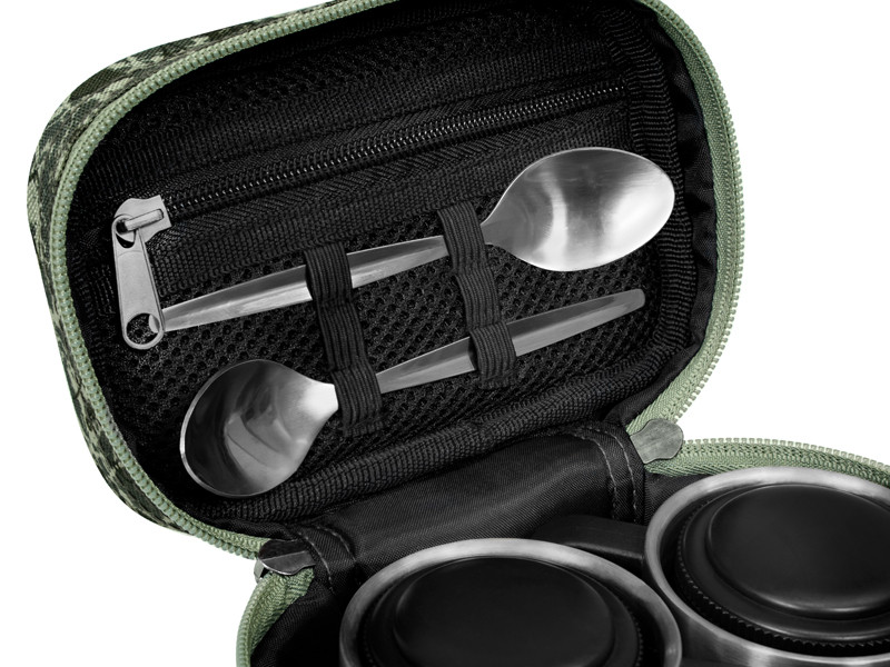 Mic ca dimensiuni, mare ca şi conţinut - aşa este Delphin COTEA. Produs cu dimensiuni de transport reduse, datorită cărora nu ocupă aproape nici un loc. Contrar acestora ascunde un set care va îmbucura pe toţi cei care savurează cu plăcere o cafea bună pe malul apei. COTEA conţine două căni de calitate din inox, două linguriţe de ceai şi de asemenea două recipiente din inox cu capac, care servesc de exemplu pentru cafea şi zahăr. Gentuţa propriu-zisă dispune de un săculeţ mic din plasă care poate acomoda fără probleme un stoc suficient de pliculeţe de ceai. În plus este prevăzută cu fermoare de calitate, iar cel exterior este echipat cu o toartă cu logo-ul firmei Delphin. COTEA are designul camuflajului îndrăgit C2G cu pictograma de efect care defineşte utilizarea acestui produs interesant.