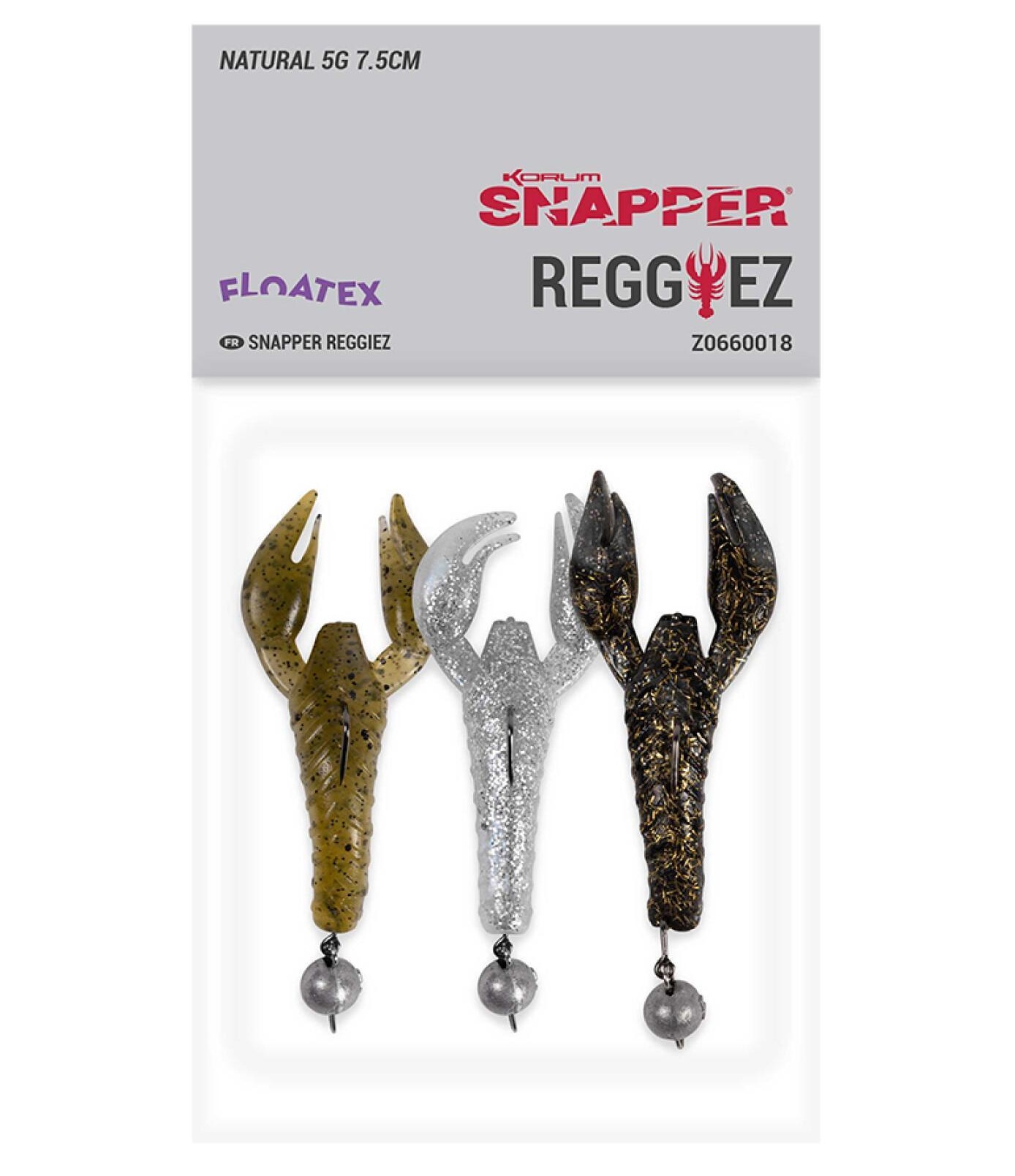 Korum Snapper Reggiez sunt creaturi ce imita fidel un crustaceu. Este o naluca plutitoare ce va fi irezistibila pentru speciile de rapitor. Materialul Floatex este special conceput de Korum pentru a fi extrem de moale dar si foarte rezistent la rupere. Aceasta naluca isi misca clestii in recuperari lente, astfel avand o miscare naturala si atragatoare pentru rapitori. Nalucile vin echipate cu un carlig offset 1/0 cu plumb Cheburaska de 5g.