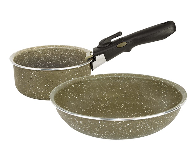 Acestea sunt proiectate pentru a fi utilizate cu o întreagă varietate de surse de căldură acasă și de pe mal și sunt finisate într-o culoare verde măsliniu cu pete albe și negre. Fiecare set cuprinde o cratiță, o tigaie și un mâner detașabil, care este compatibil cu toate tigăile din gamă și are un dispozitiv de siguranță cu acțiune dublă pentru a preveni orice șansă de eliberare accidentală atunci când manipulați tigăi fierbinți.
