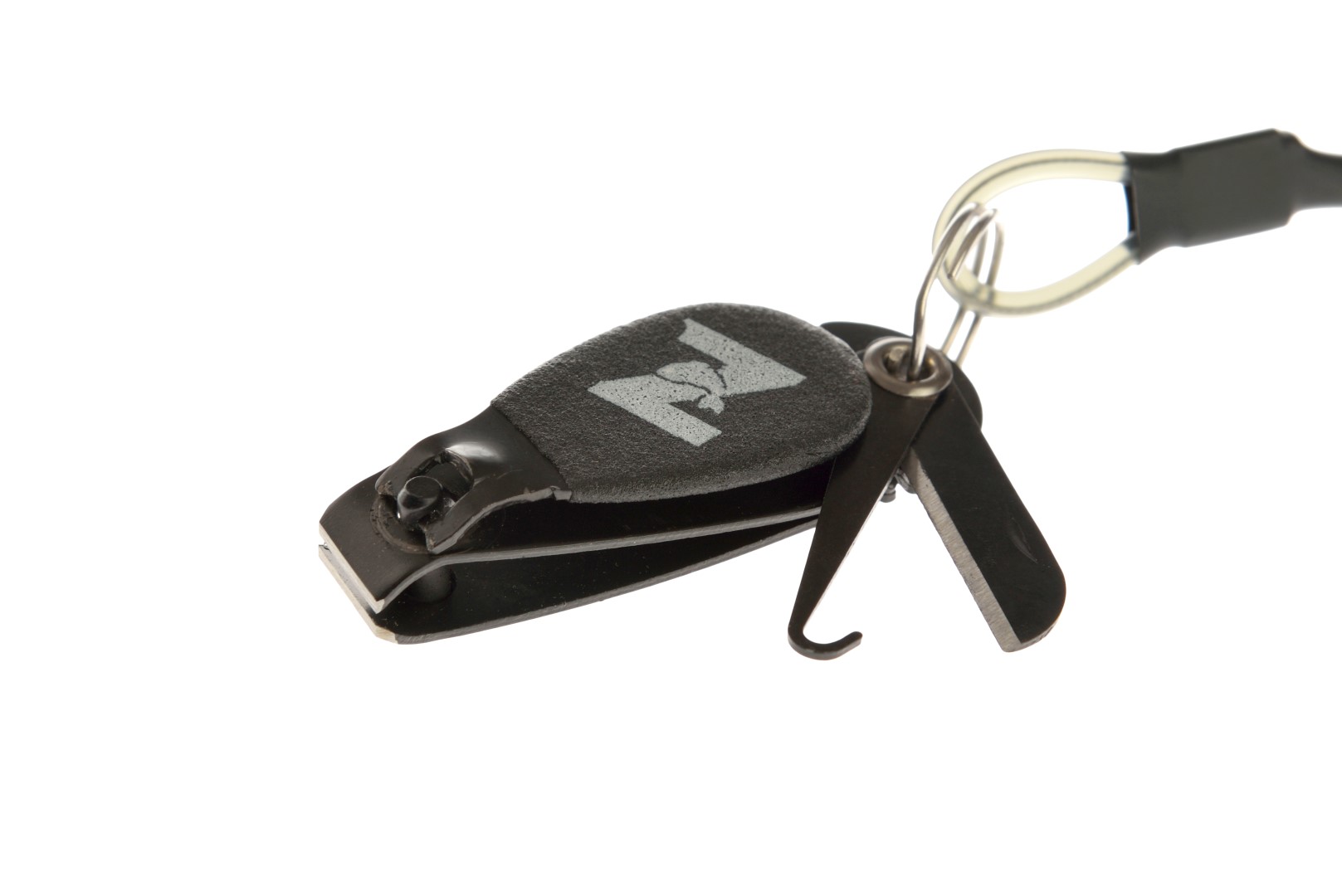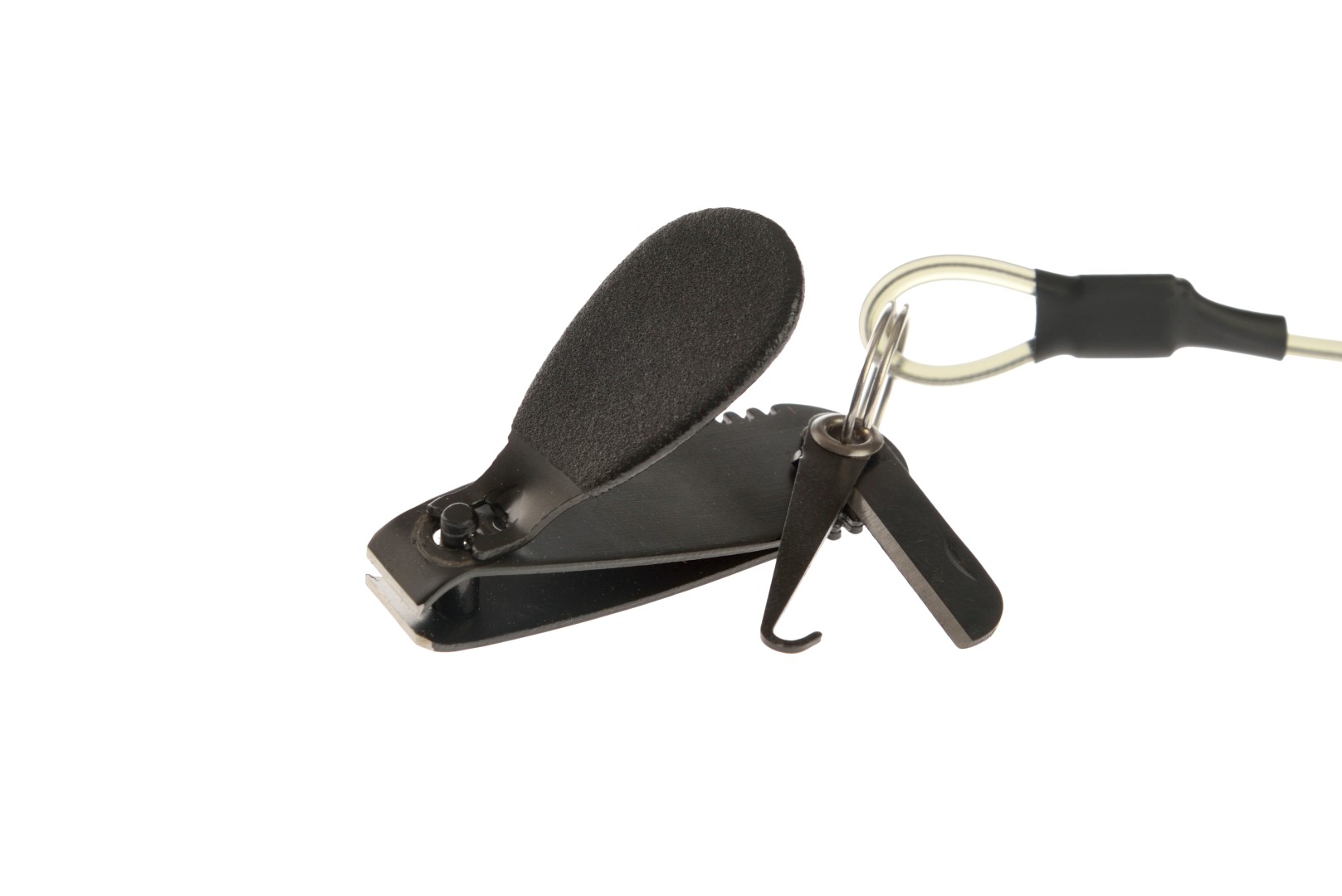 Setul include un cablu răsucit flexibil cu o carabineră la capăt, cu o lungime maximă de până la 150 cm. Acest lucru vă permite să atașați ușor unghierea de o vestă, geantă sau rucsac, având-o mereu la îndemână fără a o căuta în buzunare.