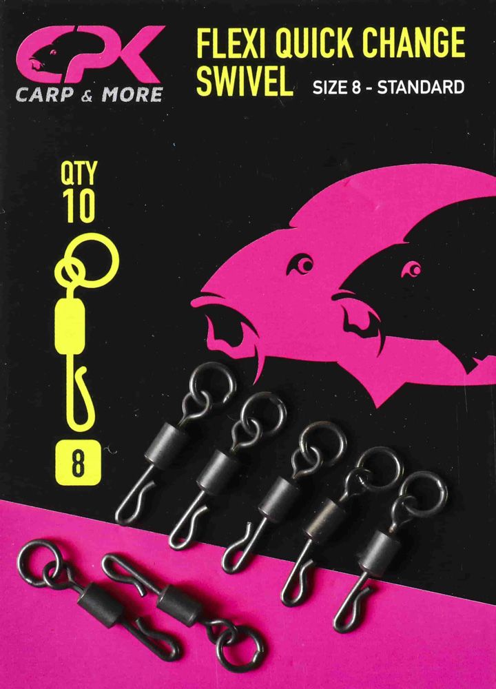 Flexi Quick Change Swivel sunt vartejuri cu anou ce au atasate o agrafa rapida, special concepute pentru schimbarea rapida a rigurilor de pe monturile Helicopter, fara sa mai fie nevoie sa taiati linia principala, sau sa legati noduri suplimentare. Datorita libertatii de miscare si a finisajului deosebit firul nu se incurca in lansare atunci cand folosim aceste agrafe rapide cu anou.